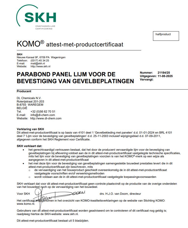 VERWERKING Voorbereiding • Een goede ventilatie tijdens verwerken en tijdens uitharden is belangrijk. • De ondergrond moet vast, effen, droog, schoon, stof- en vetvrij zijn. • Indien nodig ontvetten met Parasilico Cleaner, MEK, isopropylalcohol, ethanol. • De gebruiker dient zelf te controleren of het product voor zijn toepassing geschikt is. Eventueel onze technische dienst raadplegen. Primers • Voor sterk absorberende ondergronden adviseren wij het gebruik van Hybrid & PU Primer (transparant of zwart, droogtijd ca. 15 min). Aanbrengen • Voor de plaatsing van gevelpanelen: raadpleeg de verwerkingsinstructies op: Parabond Panel System • Het product met de spuitmond in rillen aanbrengen op de ondergrond of het te verlijmen element. Rillen moeten in verticale, parallelle en regelmatig verdeelde banden aangebracht worden, zodat luchtvochtigheid tot de lijm kan toetreden. • Het te verlijmen deel zo snel mogelijk (uiterlijk binnen 10 min) aanbrengen (afhankelijk van de temperatuur en relatieve luchtvochtigheid). Het materiaal kan nu nog gecorrigeerd worden. Daarna goed aandrukken. • Hanteer tussen de te lijmen delen een ruimte van 3,2 mm (d.m.v. Mirofix tape), zodat de lijm in staat is vervormingen op te vangen (o.a. van belang in buitentoepassingen of onder vochtige omstandigheden). Reiniging • Eventueel langs randen vrijkomende lijm kan met een plamuurmes worden verwijderd. Niet uitgeharde lijmresten zijn met Parasilico Cleaner, Multi-Purpose Super Cleaner of Cleaning Wipes te verwijderen • Na uitharding het product zoveel mogelijk mechanisch verwijderen. VEILIGHEID Raadpleeg de veiligheidsinformatie op de verpakking en de veiligheidsfiche voor meer informatie. AANDACHTSPUNTEN • Niet geschikt voor permanente onderdompeling. • Niet geschikt voor gebruik op bitumineuze ondergronden. • Niet geschikt voor gebruik op PE, PP, PA, PTFE (Teflon). • Niet geschikt voor gebruik op polyacrylaat en polycarbonaat. • Parabond Panel is een onderdeel van een lijmsysteem voor gevelpanelen. Hierbij behoren ook de montagetape Mirofix 3,2mm, Parasilico Cleaner en Hybrid & PU primer. Raadpleeg steeds de verwerkingsinstructies. • Raadpleeg steeds de technische instructies en adviezen van de gevelplaatproducenten • Verlijming van andere gevelpanelen dan vermeld in het KOMO-attest valt onder de volledige verantwoordelijkheid van de plaatser. • Respecteer de richtlijnen over de applicatie-omstandigheden (zie folder). TECHNISCHE GOEDKEURINGEN EN KWALITEITSLABELS • Franse VOS-emissie klasse A+ • KOMO attest nr. 21184/25 voor de bevestiging van gevelpanelen Trespa Meteon (HPL) en Equitone Tectiva (vezelcement)